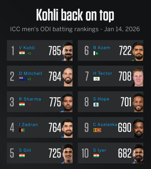 We have a new No.1 in ODIs 👑 Virat Kohli is back on top of the men's batting rankings for the first time since July 2021 0 0 replies