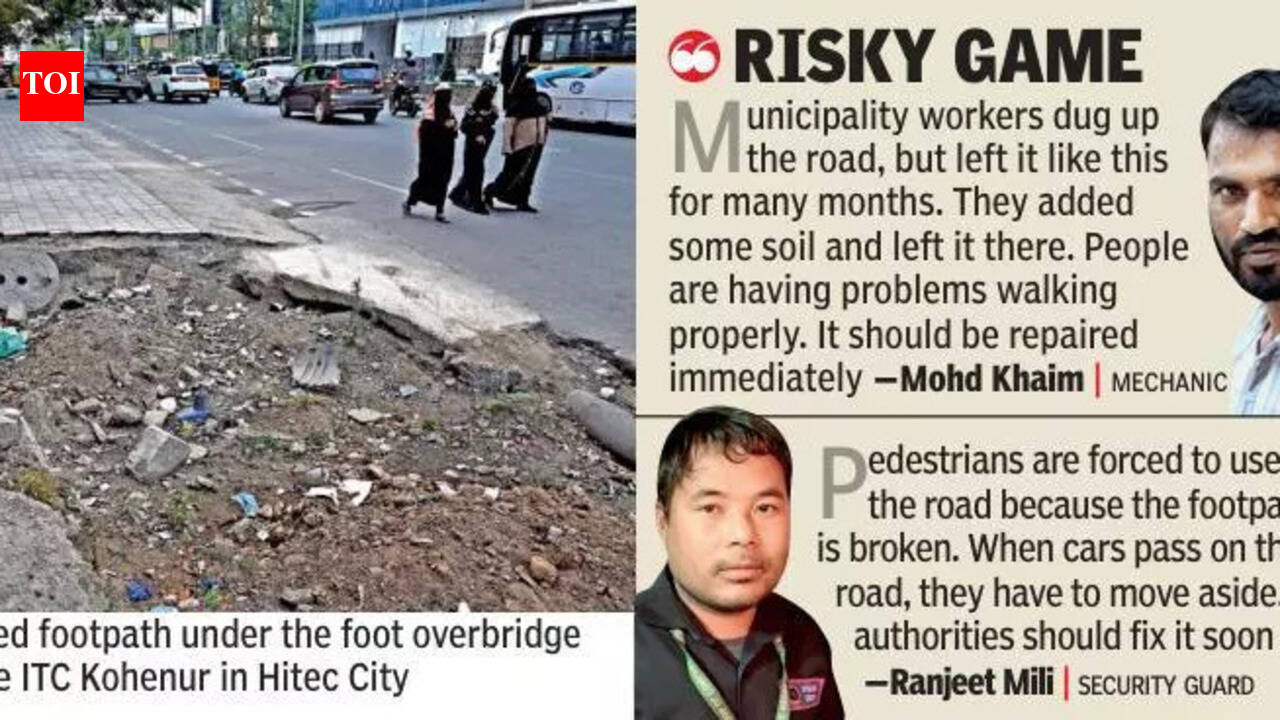 Hitec City footpath in state of disrepair for months, forces pedestrians on to busy roads