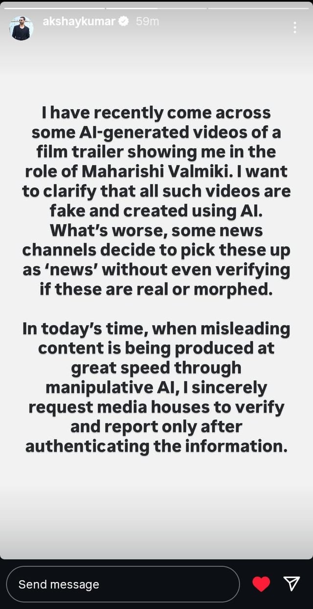 Akshay Kumar clarifies about the rumours of him as Valmiki which was just an AI generated content. 0 0 replies