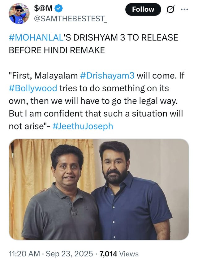 Shots fired 💀 Drishyam 3 director says he will explore legal options if the Hindi version is released first 0 0 replies